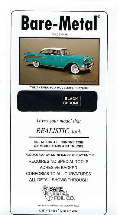 Bare-Metal® Foil is perfect for duplicating chrome on model cars, model trucks, and model aircraft. Bare-Metal® also looks great on die cast models. You can use Bare-Metal® any place that real metal would add detail to a finished kit. Bare-Metal® Foil is a thin metal foil with a self-adhesive backing. Bare-Metal® can be applied to painted surfaces or plain plastic. Plus since Bare-Metal® Foil is so thin it conforms to compound curves. Bare-Metal® Foil is the finest product of its type on the market today. For years, others have tried to copy our foil, but no one has been able to match Bare-Metal's unique qualities. Our foils come in Chrome (NEW!!), Ultra Brite Chrome, Black Chrome, Gold, Matte Aluminum, and Real Copper. Our Chrome and new Ultra Brite Chrome look great anywhere you need a chrome finish. And our colored foils can be used to simulate surfaces such as black chrome on modern cars, gold on model rockets, matte on aircraft, and copper on building roofs. These are only a few of the areas where Bare-Metal® Foil can be used. There's really no limit to the number of applications for Bare-Metal®. Our pressure sensitive adhesive easily sticks to any clean surface. Bare-Metal® has an adhesive that is not too aggressive, so it is great for masking. With the mild tack of our product, you can put the foil on your model without worrying about it wrecking your paint job. Bare-Metal® Foil is packaged in 6 x 11.75 inch sheets.