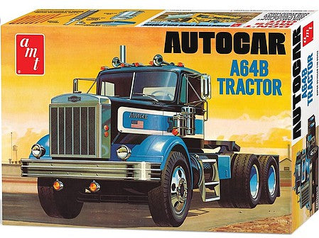 This is the 1/25 Scale Autocar A64B Semi Tractor Plastic Model Truck Kit from AMT.    Features:  Molded in white so it can be painted any color  Over 250 super detailed parts  Vinyl truck tires  Cummins 6 cylinder diesel engine  Optional fog and driving lights  Expanded decal sheet with new stripes
