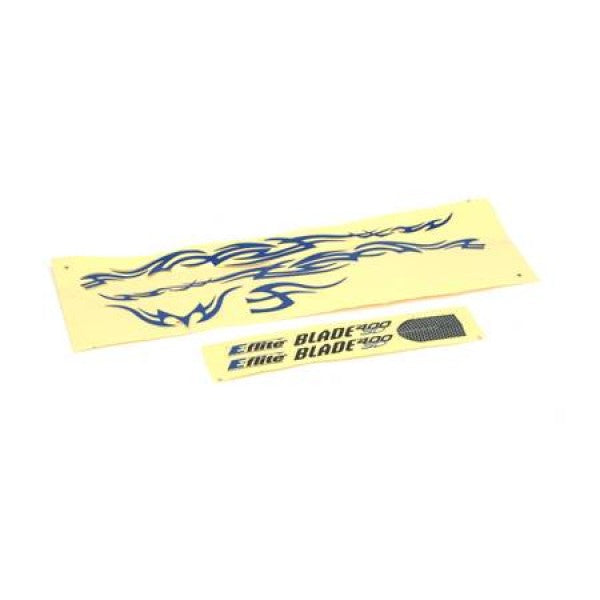 Blade Decal Sheet, Tribal (Blade 400)    This is a set of replacement Body/Canopy decal sheets for the  E-Flite Blade 400 mini helicopter. Package includes one 80x240mm decal sheet with tribal pattern and one 35x140mm decal sheet with E-Flite Blade 400 logo.