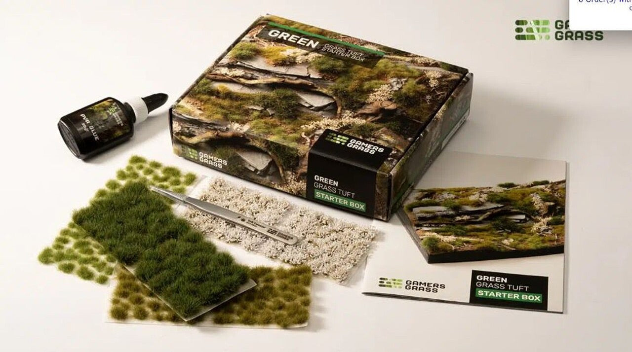 This Starter Box contains: 4 full sheets of Grass Tufts Strong Green XL White Flowers 6mm Dry Green 4mm Green 1 Pair of Tweezers 1 Bottle of PVA glue 1 Basing Guide Booklet