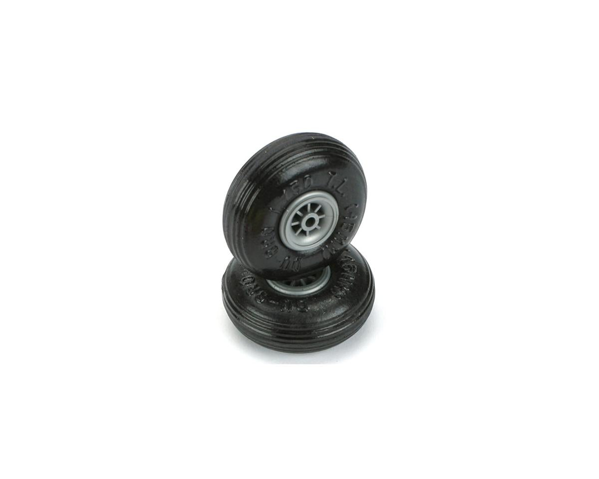 These are the DuBro 1-3/4" Treaded Lite Wheels. These high quality, low bounce and balanced wheels come pre-mounted on a sporty eight spoke hubs.    Features:    Fits inside most wheel pans and retracts  1/8" (3mm) axle diameter can be drilled out to 5/32" (4mm)  Light weight  Eight spoke hub design  Shock absorbing  Made in the USA    Specifications:    Diameter: 45mm (1.75")  Hub Diameter: 3mm (0.125")  Width: 16.25mm (0.640")    Includes:    (2) 1-3/4" Treaded Lite Wheels