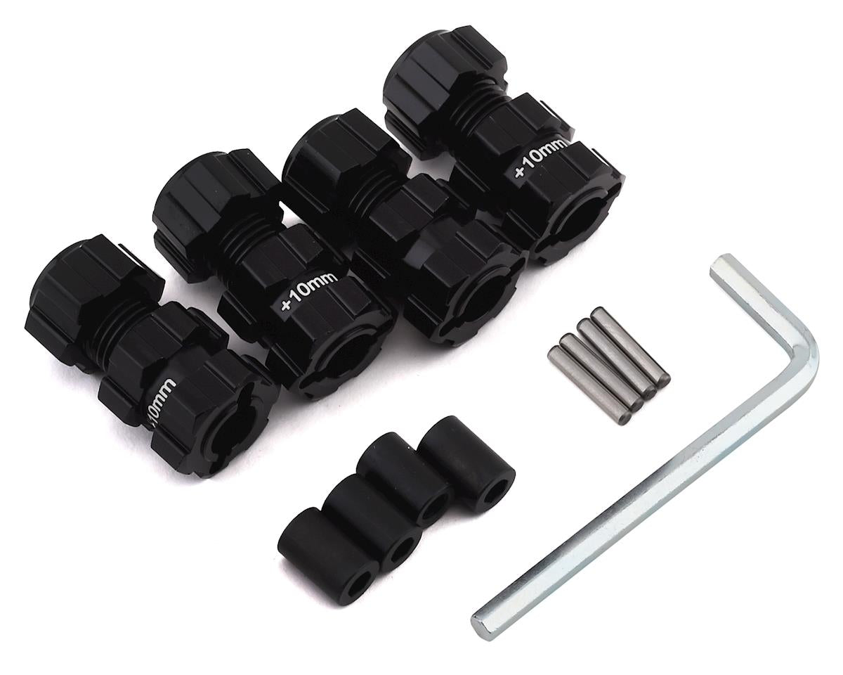 This is an optional set of Hot Racing Aluminum 10mm Offset 17mm Hex Hubs. These light weight, high performance hubs are perfect for Arrma 4S BLX vehicles. Features: Reduces chance of stripping stock Wheel nut. Widens stance of vehicle by approximately 10mm per side to increase stability over rough terrain 17mm closed end dirt shielding wheel nuts with o-ring grip CNC machined 6061-T6 aluminum construction Adapters are anodized black in color, wheel nuts are anodized vibrant red Includes: (4) Four +10mm Wheel Adapters (4) closed end dirt shielding wheel nuts (4) axle hub barrel nuts (4) 2.5x14.7mm axle pins (1) hex wrench