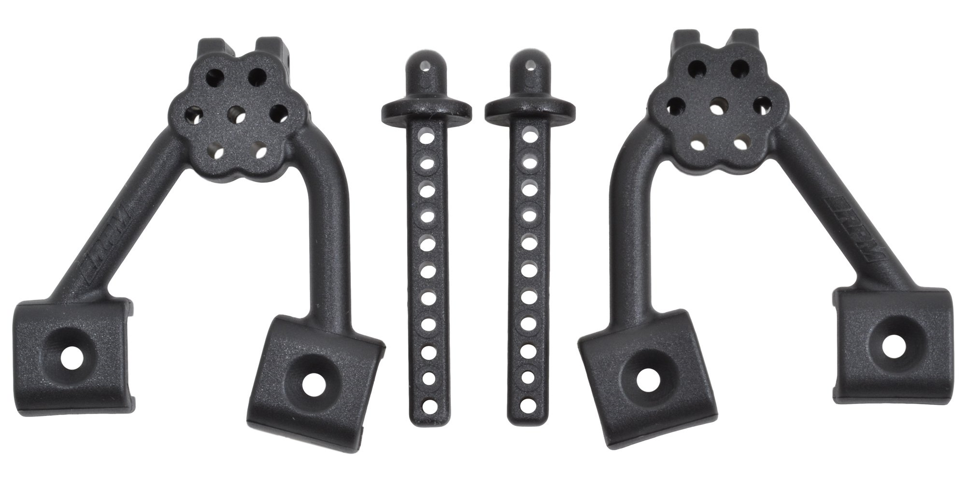 RPM Shock Hoops and Body Mounts for the Axial SCX10 are an affordable alternative to stock that improve durability and increase suspension options. Our versions incorporate stock shock mount locations along with two upper and two lower shock mounts (for a total of 7 shock mount options) that raise or lower the suspension just over 5mm (.205”). Simply moving the upper shock mount to one of these locations via one screw per shock makes ride height changes simple, cheap and very effective.    RPM Shock Hoops use a unique frame mount that wraps both above and below the frame rails to help reduce the amount of impact forces transferred through the mounting screw’s threads. Our C-clamp style mounts also improve structural rigidity of the shock mount for more accurate and precise suspension set-ups.    As a bonus, the included Body Posts are more stout and stronger than stock plus they bolt to RPM Shock Hoops using two screws for a secure body post that won’t rattle around. With a fixed set of body posts, your scale rig will look even more realistic since the body won’t be shifting around while you’re climbing and crawling.    RPM Shock Hoops and Body Mounts are a lightweight alternative and built from our bulletproof blend of engineering grade nylons for unsurpassed performance at an unbeatable price!