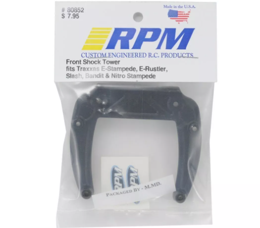 This is an optional RPM Front Shock Tower (Rustler,Stampede,Bandit,Slash) This is the optional RPM Front Shock Tower for the Traxxas E-Stampede, E- Rustler, Bandit & Nitro Stampede. FEATURES: Plastic construction Black in color INCLUDES: One Front Shock Tower for the Traxxas E-Stampede, E-Rustler, Bandit and Nitro Stampede SPECS: Width: 3.26" (83mm) Height: 2.91" (74mm) Thickness: .27" (7mm)