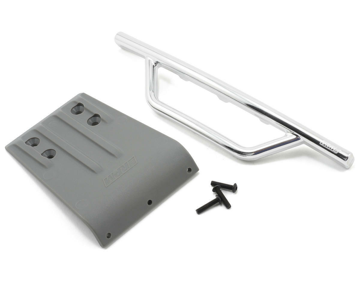 his is an optional RPM Traxxas Slash Front Bumper & Skid Plate in Chrome    They’re here! An all-new bumper design for the Traxxas Slash! Our two-piece design is simple, yet strong, effective and highly attractive. We made it a two-piece design to give the Slash owner the option of full front-end bash-proof and crash-proof protection with both the skid plate and bumper installed or if a racing profile is wanted, the front bumper can be removed and the skid plate by itself can be run as a light-weight alternative bumper / skid plate that shreds 27 grams (almost a full ounce) of weight from the front end of the truck. Once the race is over, reinstall the bumper and full bash protection is once again available!    Our Traxxas Slash front bumper design completely eliminates the stock chassis-to-bumper support ring and the 5 screws holding the support ring in place. Additionally, the RPM version uses a thicker skid design (more than 60% thicker than the stock skid!) to supply the cushioning resistance a basher-proof bumper needs. Even though our thicker, more stout front bumper and skid plate is significantly stronger and more beefy than stock, it still falls in at a weight that is slightly less than the stock front bumper*. So even if the racer wants to run a full RPM front bumper and skid plate, they won’t have to worry about adding unwanted weight. To help improve overall durability, our skid rail design is wider than stock, which perfectly matches the design of our front and rear Slash skid plates.
