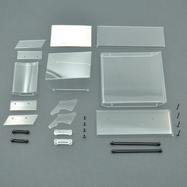 Includes: (1) Top Wing Center Section (1) Top Wing Left Side Board (1) Top Wing Right Side Board (1) Top Wing Mount (2) Top Wing Nut Plate (1) Front Wing Center Section (1) Front Wing Left Side Board - Angle Cut (1) Front Wing Right Side Board - Angle Cut (1) Front Wing Left Side Board - Straight Cut (1) Front Wing Right Side Board - Straight Cut (2) Front Wing Mount Plates (2) Front Wing Nut Plate (2) Front Wing Spacer Plate (4) M2 x 6mm Truss Head Screws (4) M2 x 12mm truss head screws (1) Top Wing Double Stick Tape - (used to secure center section to mount) Note - panels are clear polycarbonate, they are not painted as shown in image. All panels include a thin protective layer that needs removed before painting or decal application.